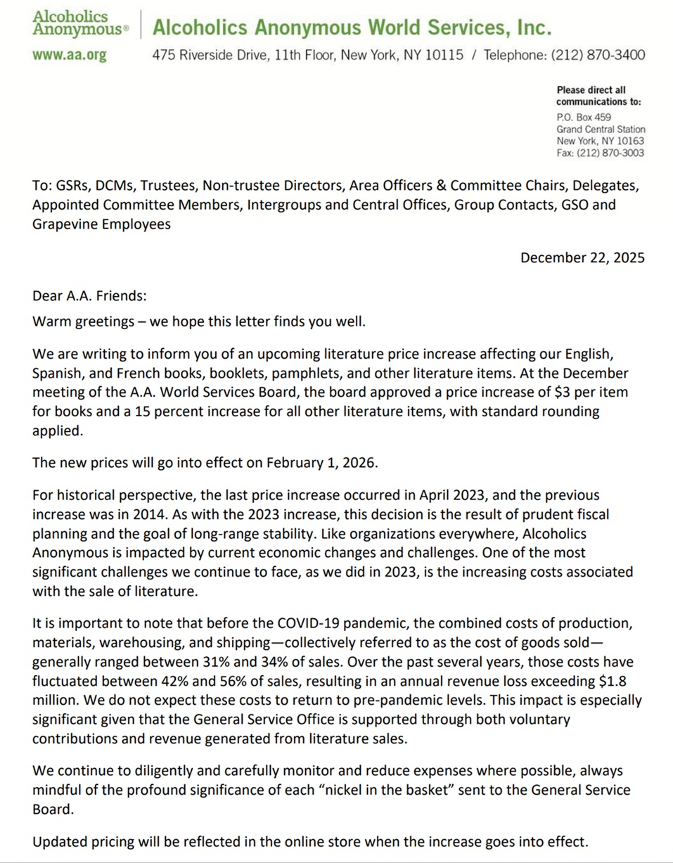 New Saturday 9AM Leominster MeetingSaturday 9AM Grapevine discussion meeting at Peer Recovery, 40 Spruce Street in Leominster. ... (more) Mon Jan 19 Lunenburg AnniversaryLunenburg 40-ish Annivesary Monday January 19, 5:30 pm. See flyer for details. ... (more) AAWS Price Increase AnnouncementPrice increase goes into effect February 1st 2026. ... (more) Thu |
