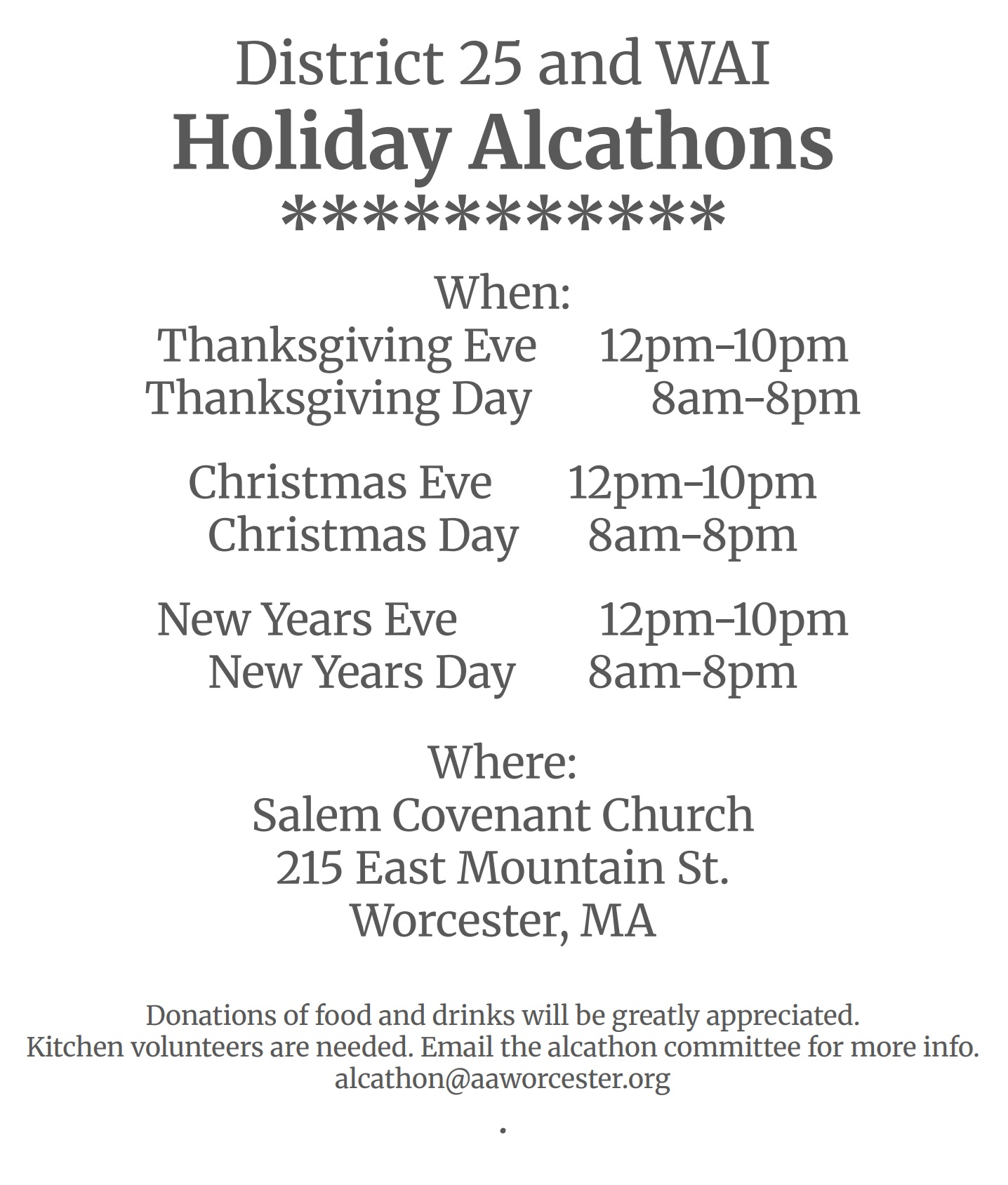 Wednesday December 24 12-10pm and Thursday December 25 8am-8pm. For inquiries email alcathon@aaworcester.org