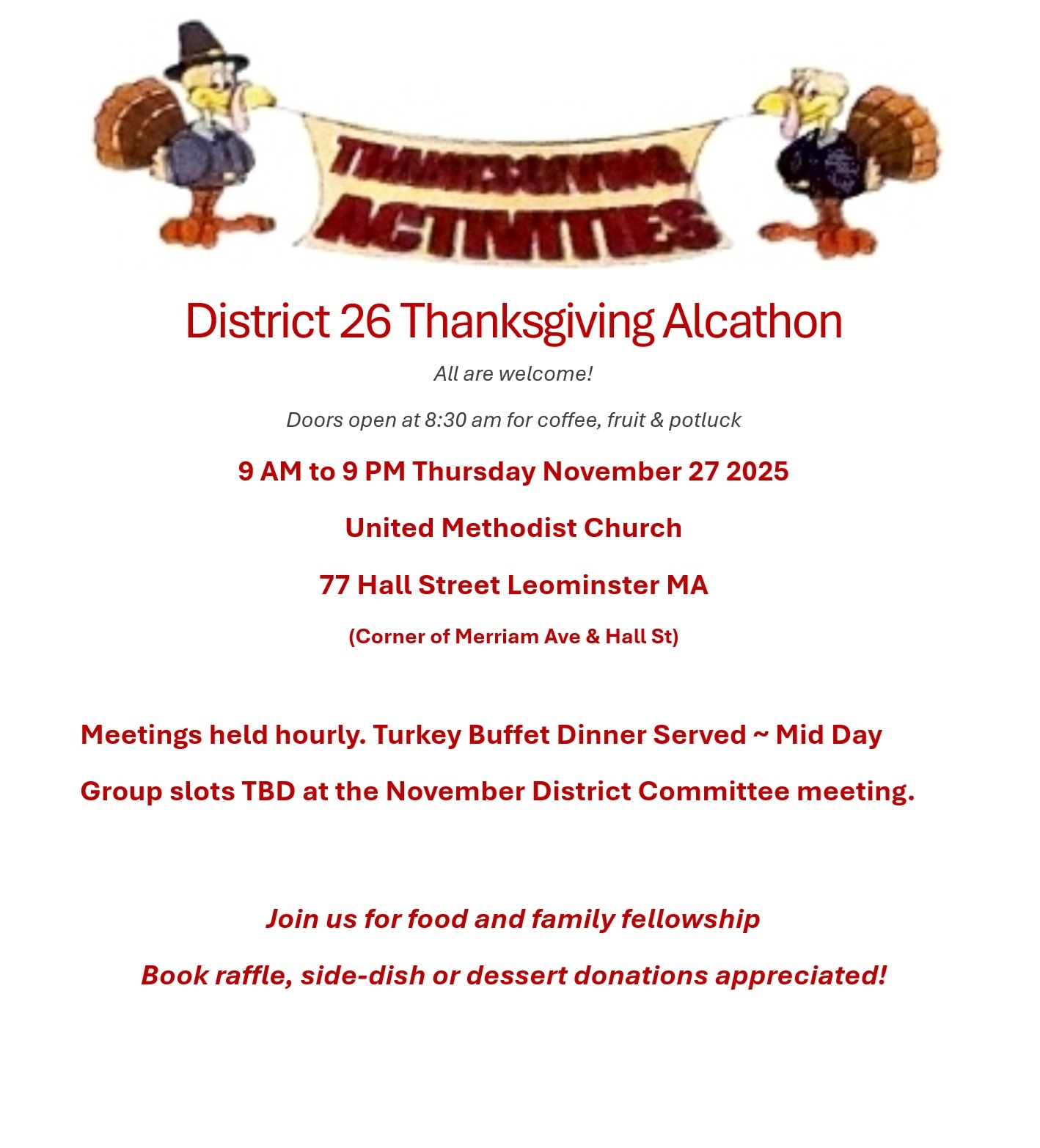 Groups seeking an alcathon slot may email Amy & Melinda at activities@aadistrict26.org.