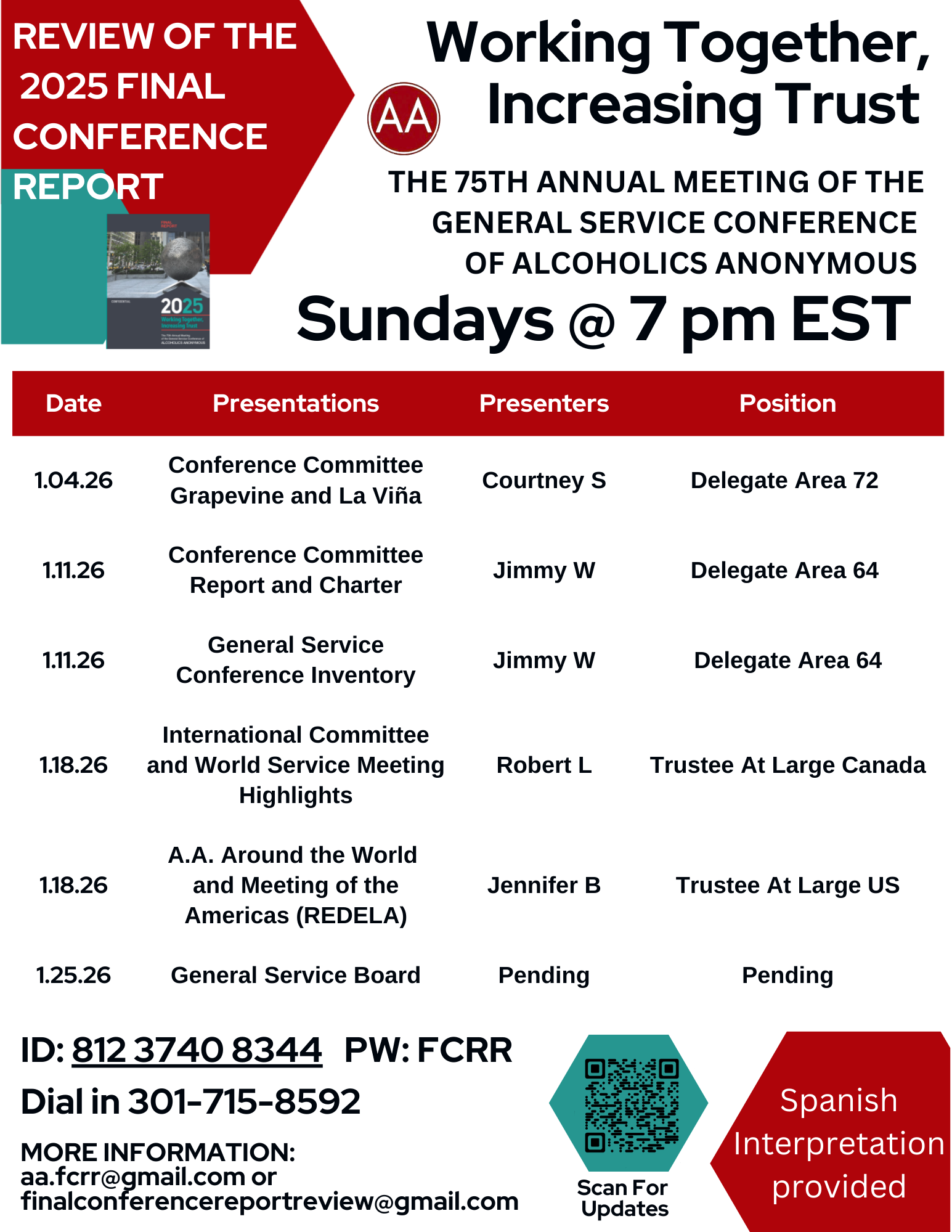 A weekly review of the 75th General Service Conference Report is being held Sundays, 7 pm EST via Zoom. See flyer for details.